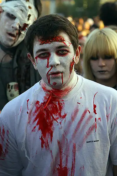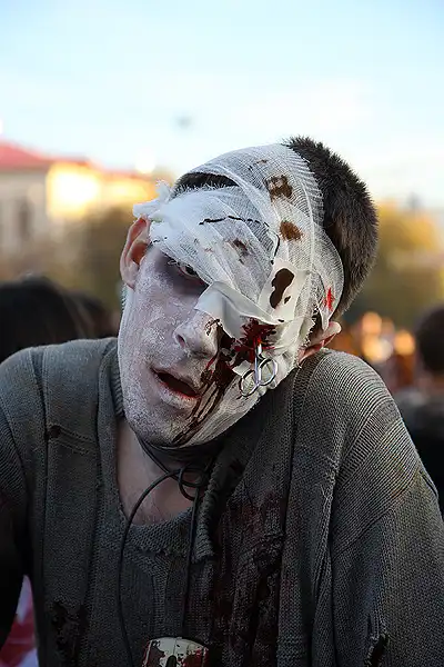 Среди общей зомби-массы особенно выделялись несколько «нечеловек», которые, в отличие от многих, заметно потрудились над перевоплощением в «живых мертвецов». Один из них — программист Александр — решил перенести реальную профессию в зомби-образ. На парад он пришел в костюме повешенного на компьютерной мышке программиста. Помимо бинтов, окровавленной компьютерной мыши, намотанного на шею провода от нее и кровавого грима Александр «воткнул» себе в глаз ножницы. Его коллега по зомби-цеху Анна сымитировала однорукость и потрескавшуюся от разложения кожу, используя для этого клей ПВА и скомканную бумагу. Самым популярным атрибутом была, конечно же, кровь — ее все делали из гуаши и акрила.
