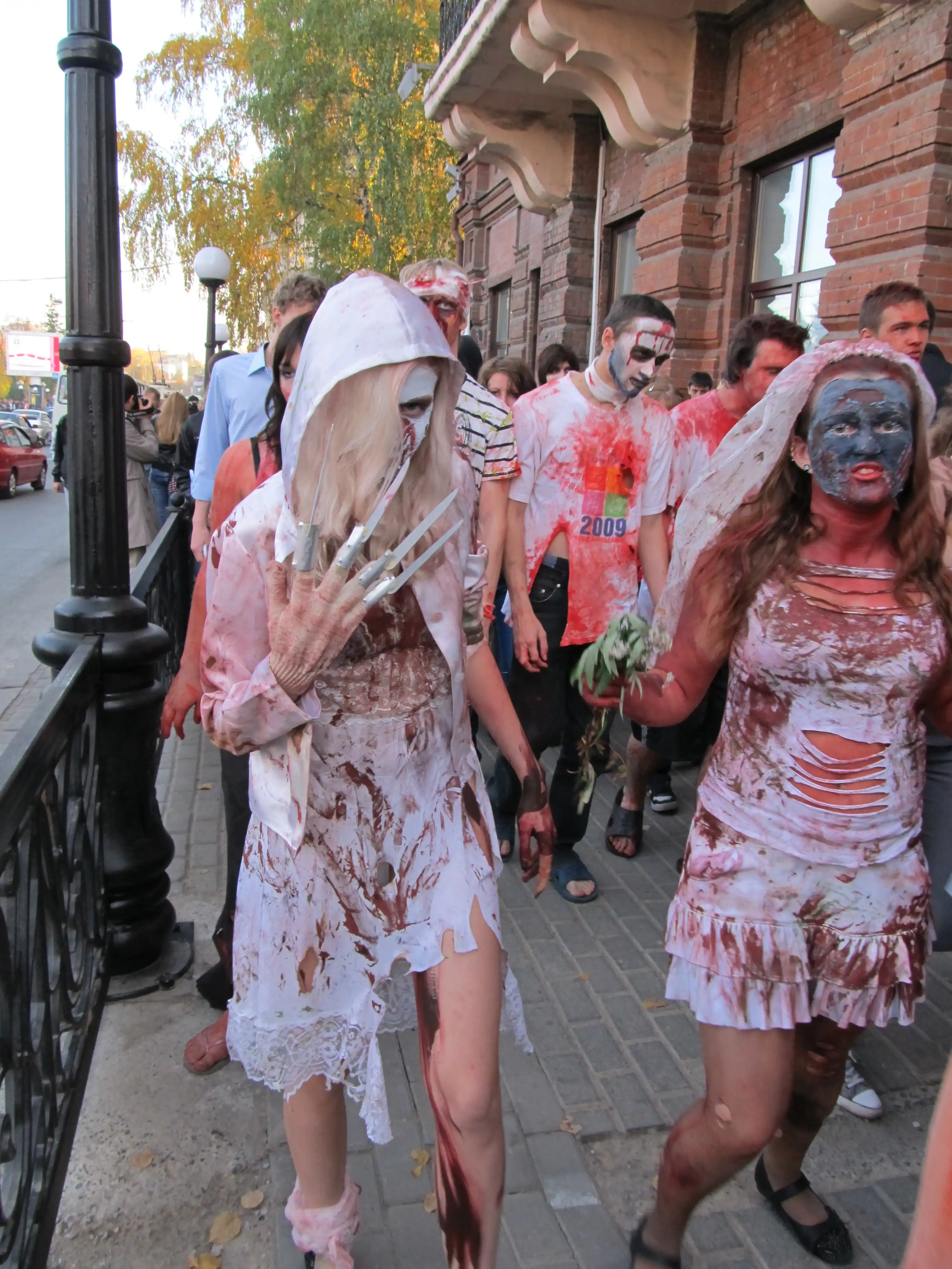 О том, что в Томске пройдет парад зомби, как окрестили его организаторы, я узнала из социальной сети «В Контакте». Мои друзья и знакомые наперебой копировали сообщение о проведении действа в эти выходные. При этом организаторы шествия восставших из мертвых утверждали, что такой парад в нашем городе пройдет впервые. Как же, подумалось мне, зомби уже появлялись на томских улицах — этим летом дважды инициативные ребята устраивали флешмобы на эту тематику. Правда, участников они собрали крайне мало. То же, что томичи увидели сегодня, превосходило даже самые смелые ожидания — перевоплотиться в зомби пожелали сразу несколько десятков человек. Желающих поглядеть на парад «живых мертвецов» и пройтись с ними по центральной улице Томска нашлось еще больше.