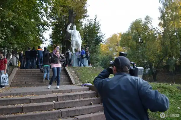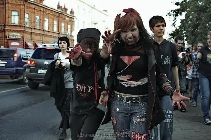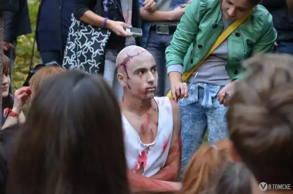 Сбор зомби различных модификаций был назначен в аллее геологов на Кирова, около корпуса ТПУ. Уже издали был слышен рев восставших из мертвых и видна большая толпа людей. Подойдя ближе, я обнаружила около сотни людей в гриме, рваной одежде, перемазанных с ног до головы красным. Кто-то с удовольствием позировал перед фотографами и телекамерами, кто-то знакомился с другими представителями зомби-сообщества, а кто-то спешно дорисовывал себе мертвецкую бледность и кровавый макияж. Наконец, организатор парада зомби Александр Ершов призвал всех выдвигаться. И толпа нелюдей двинулась в сторону проспекта Ленина.