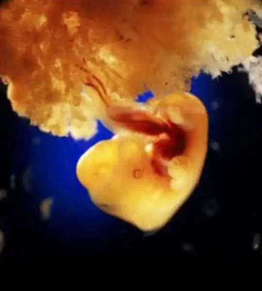 Пятинедельный эмбрион, длина 9 мм, уже угадывается лицо с отверстиями для рта, ноздрей и глаз.
