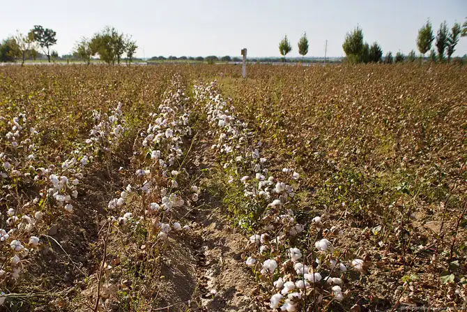 Немного общей информации для тех, кто как и я до поездки в Узбекистан, никогда не видел, как растет хлопок. Хлопок растет на полях на небольших кустах высотой примерно по пояс.
