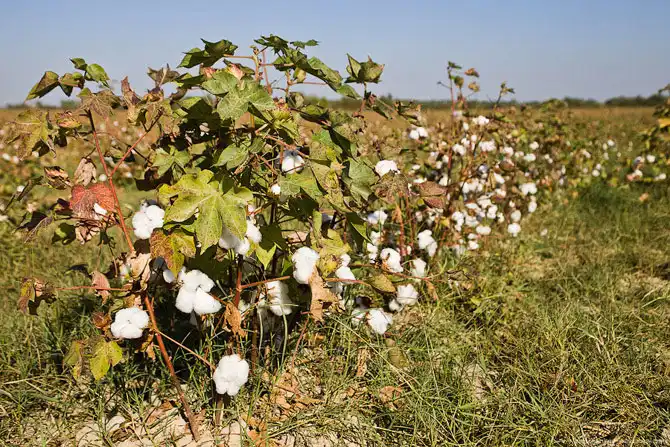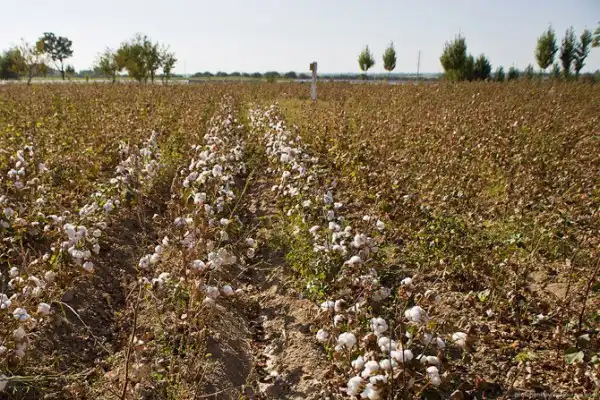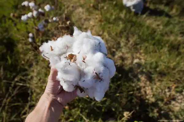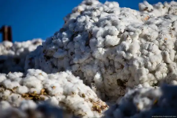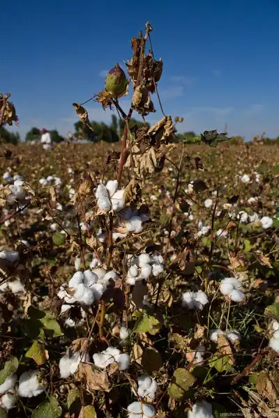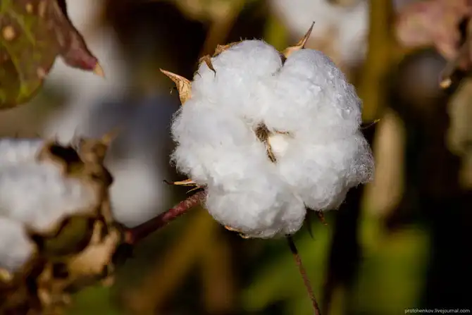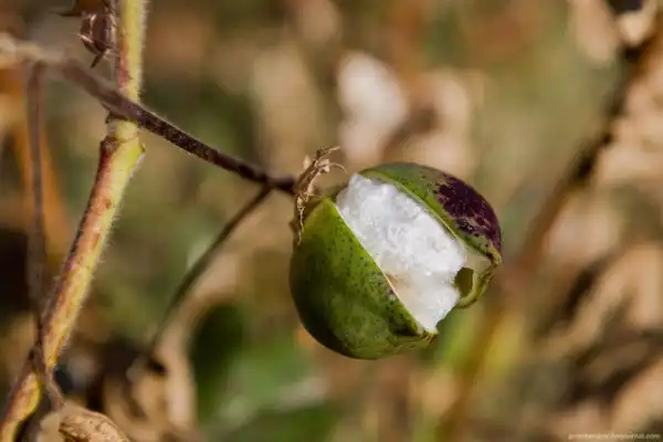 Перед сбором урожая на поля перестают подавать воду. Поэтому хлопчатник засыхает. Сама «вата» созревает в так называемой коробочке. На этой фотографии коробочка рассохлась и раскрылась (возможно в обратном порядке).