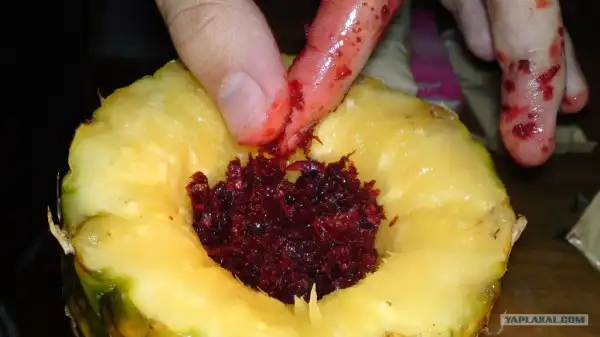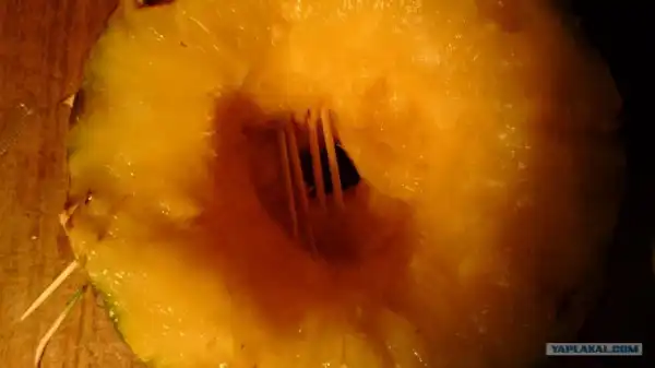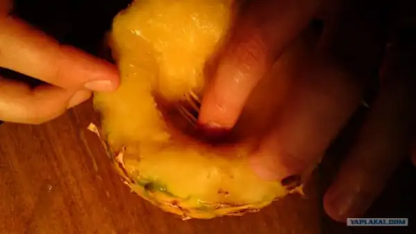 Следующий шаг. Берем ананас. Режем пополам. Половину делим и сьедаем. Со второй половины делаем чашу.