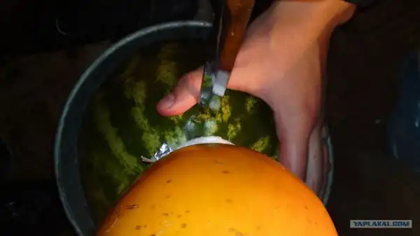В дыне делаем сквозное отверстие. Внизу диаметром около 1,5 см. сверху диаметром около 3 см. Продуваем, дабы выдуть все семечки.