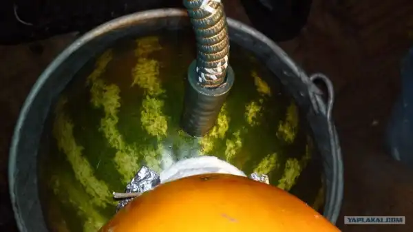 В нашем случае скалки не было, так как делать приходилось в условиях полевых. Это размятый арбуз. Где-то половину обьема жидкости выливаем в кусты.