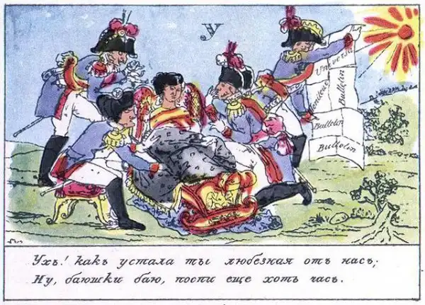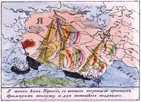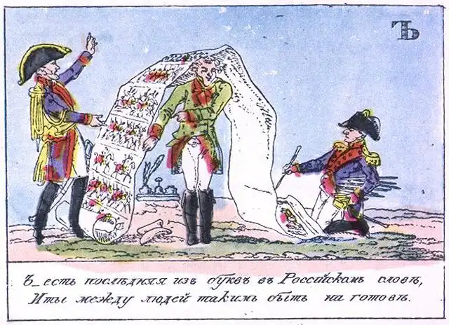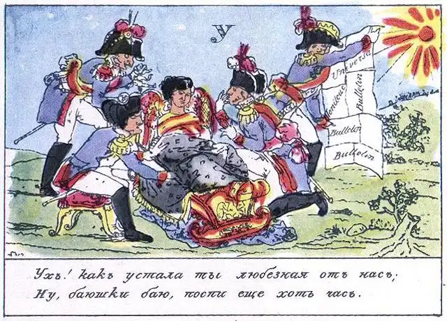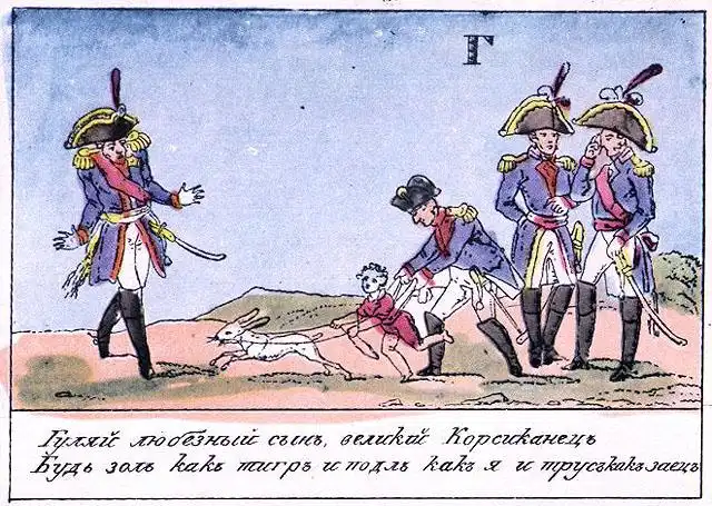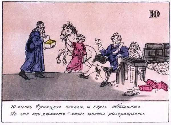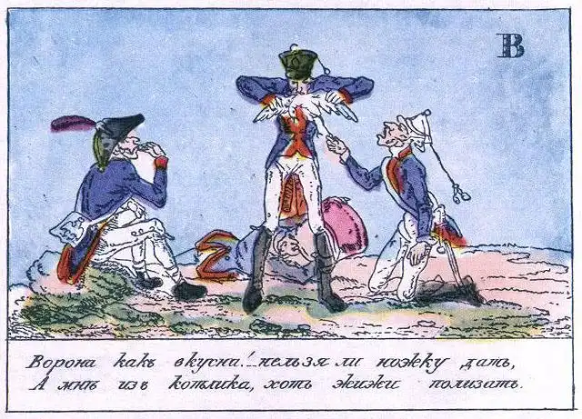 Маленькие карточки «Азбуки» должны были раскрыть перед глазами ребёнка картину только что миновавшей войны. Он узнавал о мужестве и находчивости простых русских людей, видел разложение еще недавно победоносной французской армии, трусость, мародёрство, постыдное бегство её солдат, учился презирать захватчиков, посягнувших на национальную независимость России.