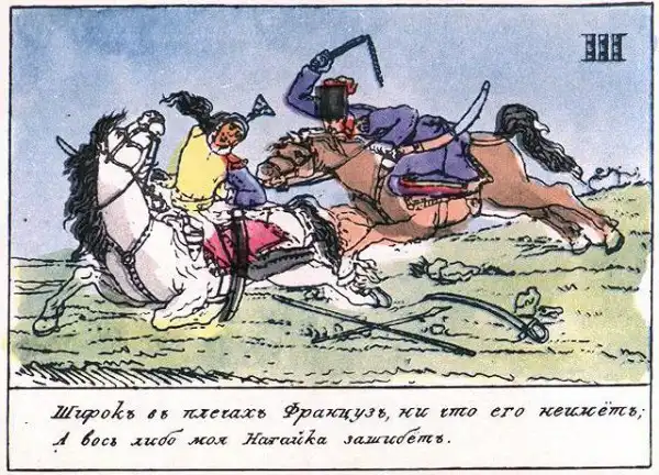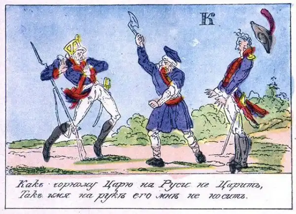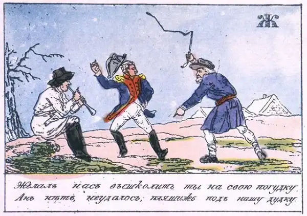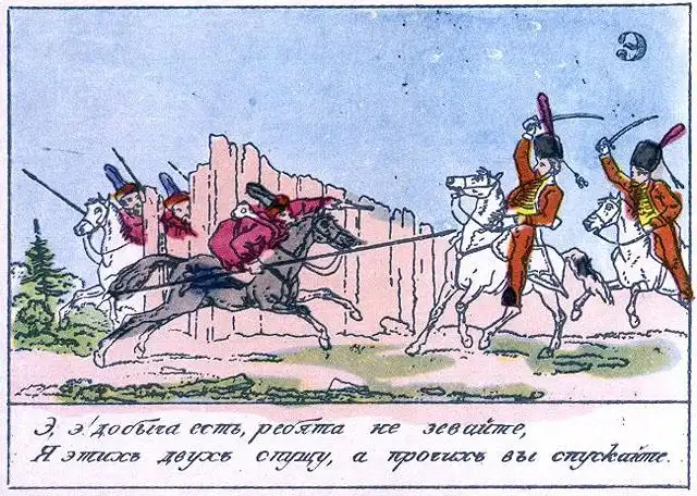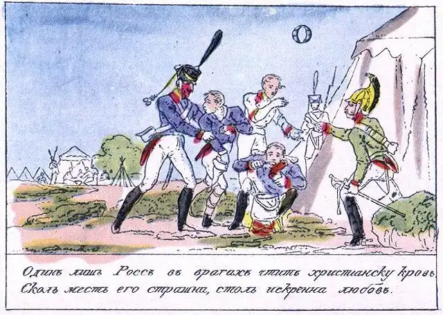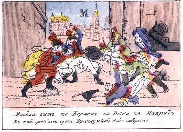 Из картинок «Азбуки» дети узнавали о многочисленных примерах героизма и самоотверженности: о старике, притворившемся глухим, чтобы не выдать французам, где скрываются его односельчане, укрывшиеся от врага в лесу (буква «А»), о старостихе Василисе, которая, командуя своим крестьянским войском, вооружённая лишь косой, брала в плен французов (буква «И-I»). Особенно трогателен эпизод, запечатленный на листе с буквой «О». Он напоминает о том, что и в жестоких испытаниях войны русские люди не забывали о доброте и человечности. Возле палатки. у котла с пищей двое русских солдат кормят трёх французов. Один из них уже ест, другой тянется за куском, третий благодарно целует в плечо русского солдата. Под листом полная достоинства надпись: «Один лишь Росс в врагах чтит кристианску кровь. Сколь месть его страшна, столь искренна любовь».