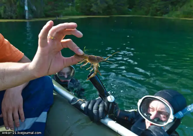 Уже на обратном пути, совсем отчаявшиеся и приунывшие, мы обнаружили удивительное по красоте лесное озерцо с чистейшей водой цвета бирюзы, почти без рыбы, но зато с раками!