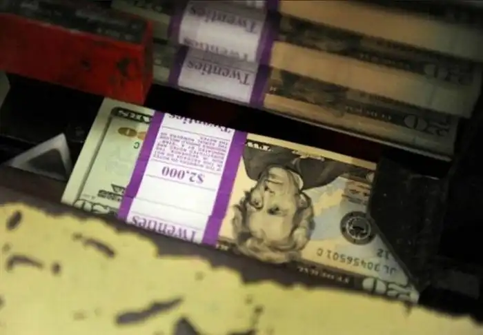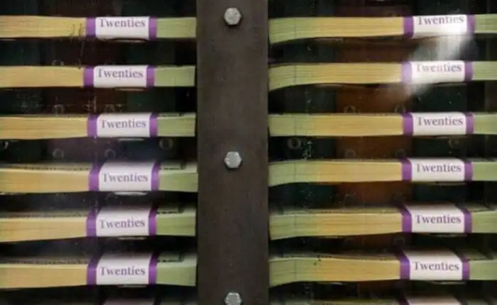 На этой табличке указана общая стоимость каждой пачки 20-долларовых банкнот.