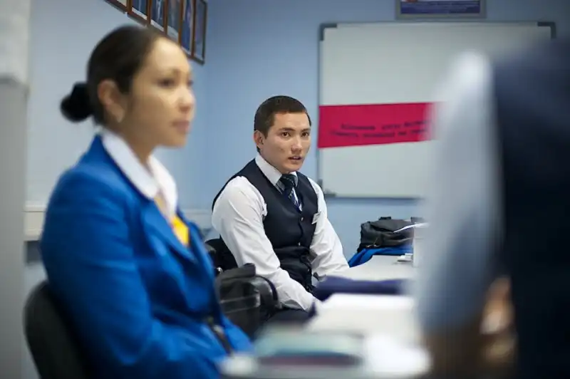 36. Тренинг проходит в имитированном Boeing 757 и Boeing 767. Тренер Нурмагамбет Менжею объясняет бортпроводникам задачу курса