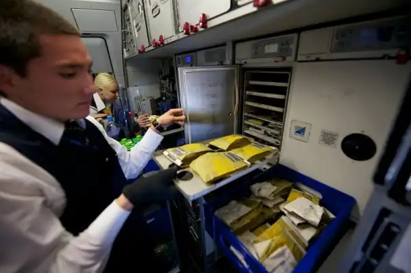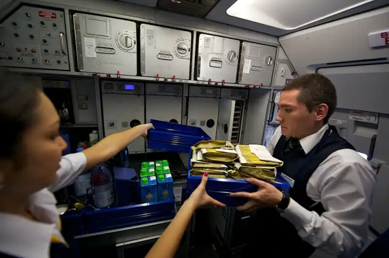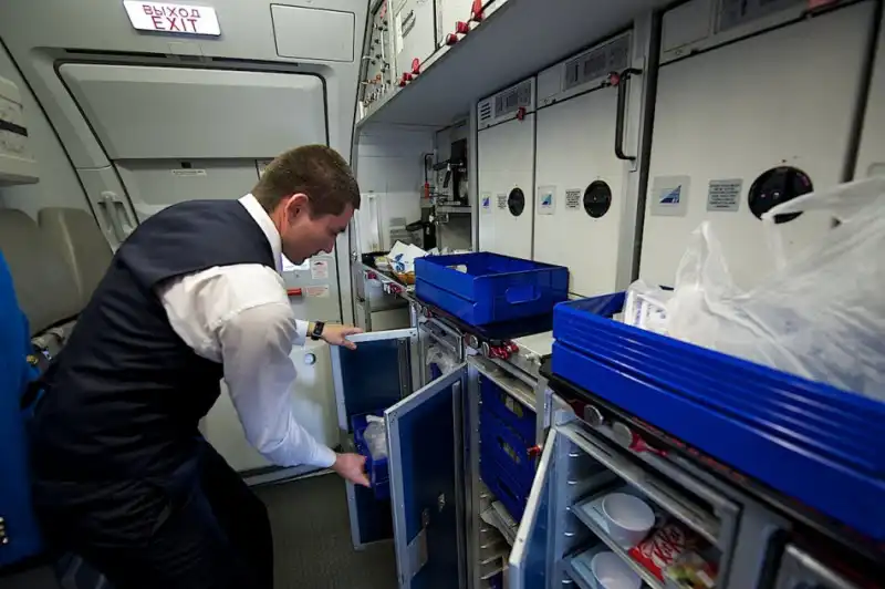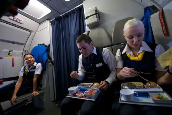 26. Когда все дела сделаны, у бригады есть время поесть. Питание для бортпроводников привозят отдельно. Если пассажир за короткое время перелета просто перекусывает, то у стюардов сейчас время обеда, после которого они целый день снова на ногах