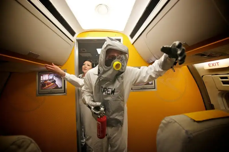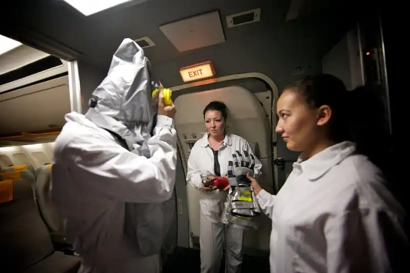 41. Самая важная часть учебной программы – изучение возможных экстремальных ситуаций. Бортпроводников учат пользоваться огнетушителями, дымозащитными масками, кислородными баллонами. Последнее применяется на практике, когда у пассажиров случаются проблемы с сердцем