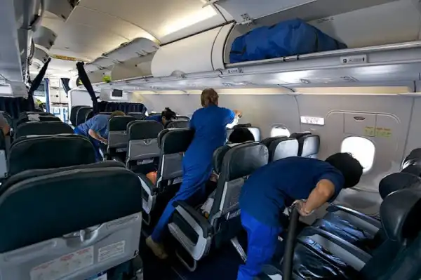 11. В это время салон готовят для нового рейса. Пока пассажиры ждут посадки, сотрудники клининговой службы приводят все в порядок