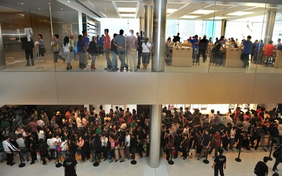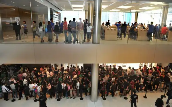 Покупатели в токийском магазине Apple Store. Обновленная версия iPhone 4S была представлена Apple 4 октября. От Apple ожидали, что компания продемонстрирует iPhone пятого поколения, однако Apple ограничилась глубокой модернизацией iPhone 4.