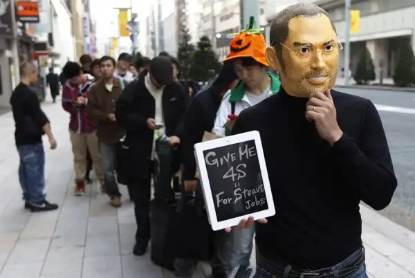 Человек в маске, изображающей основателя компании Apple Стива Джобса стоит в очереди, чтобы купить iPhone 4S перед входом в магазин Apple Store в Токио 14 октября 2011. Как пишет Reuters, потребители во всем мире охотятся за iPhone 4S, потому что это один из последних продуктов Стива Джобса (Steve Jobs) - он ушел из жизни на следующий день после презентации нового смартфона.