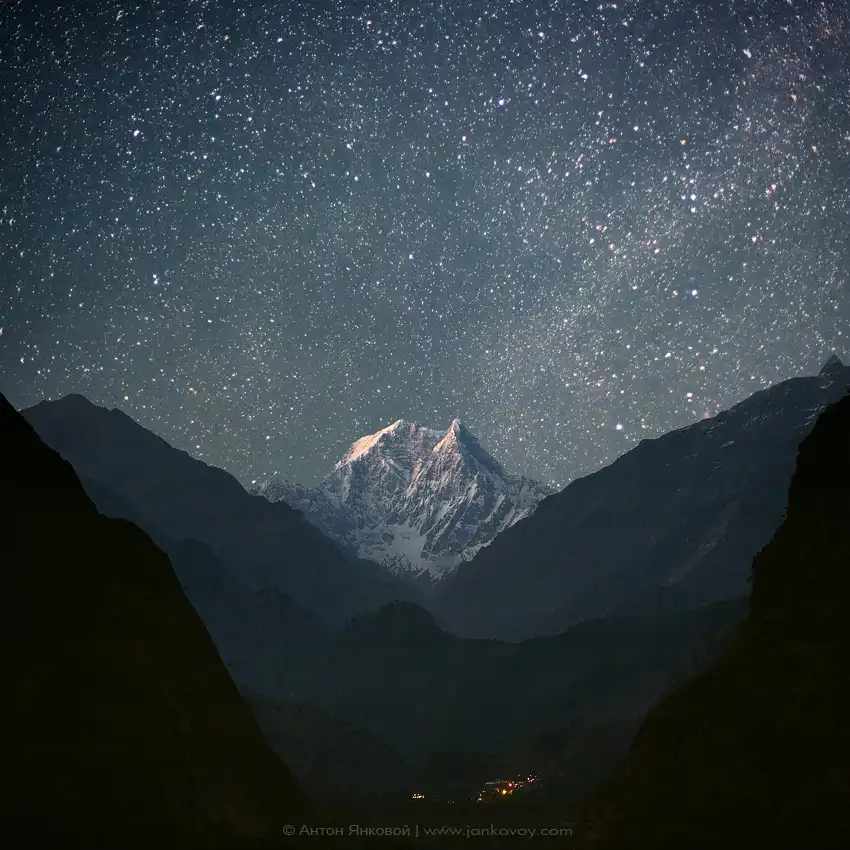Фото "Россыпи звёзд над Нилгири". Трэк вокруг Аннапурны, вид на долину Kali Gandaki Valley и Nilgiri South (6839 m) из Tatopani (1190 m).