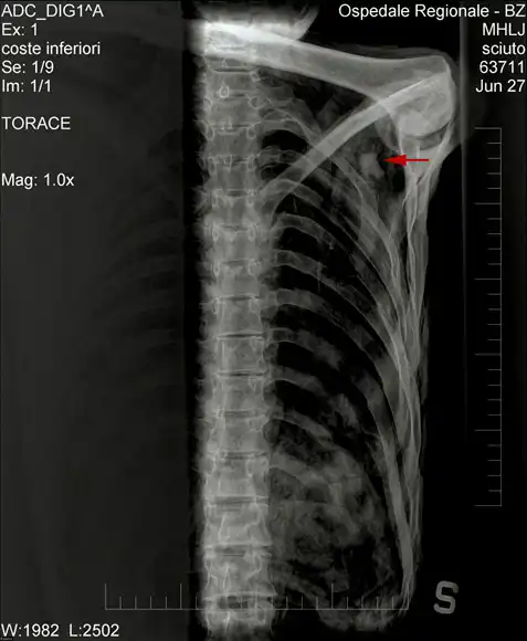 Рентген плеча «ледяного человека», наконечник стрелы отмечен красной стрелкой.