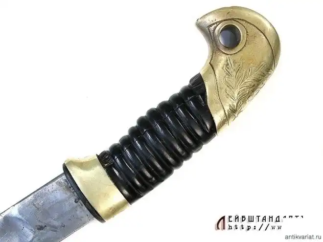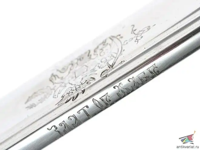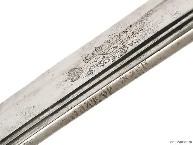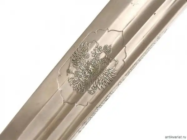Клинок с двумя узкими долами, у основания клинка с оборотной стороны - орнаментальный травленый картуш с Государственным гербом и надписью "Златоустъ Ор. Фабр.". Черен рукояти изготовлен из черно-коричневой кости, прибор рукояти - из серебра 84 пробы, украшен уставным черненым растительным орнаментом.