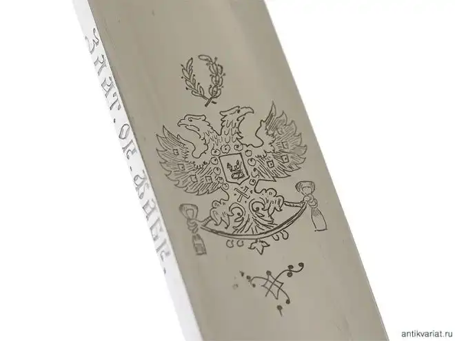 Массивный златоустовский клинок украшен уставными травлеными изображениями двуглавого орла и вензеля Николая Второго, на обухе клинка - надпись "Златоустовская оружейная фабрика. На дужке - гравированная с обеих сторон надпись "За Храбрость"