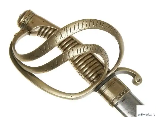 Золотое оружие "За храбрость" - офицерская наградная кавалерийская сабля образца 1827 года. Две дужки гарды украшены гравированными надписями "За храбрость". Клинок из дамасской стали с красивым многослойным рисунком, без клейм. Весь металлический прибор рукояти и ножен изготовлен и украшен в технике таушировки золотом по вороненой стали: на рельефную стальную основу аккуратно набивались кусочки раскатанного листового золота - эта техника была характерна для Златоустовских мастеров середины либо конца XIX века.