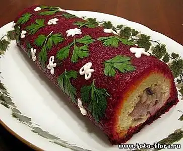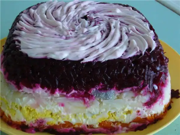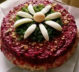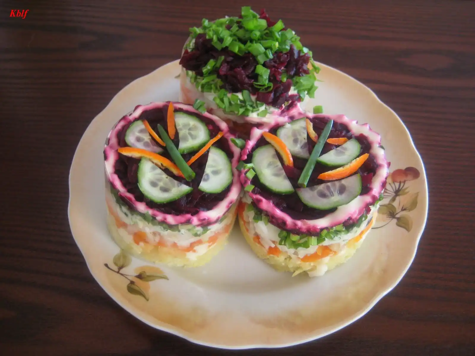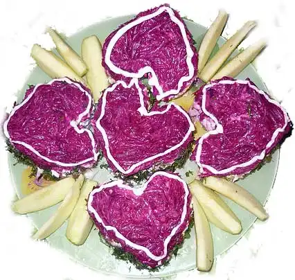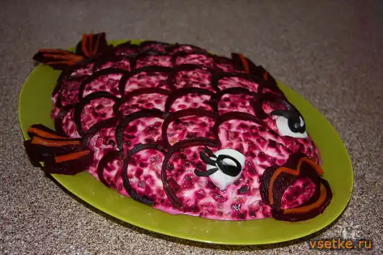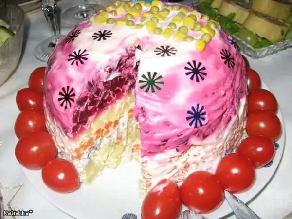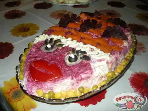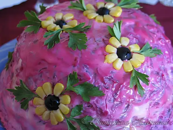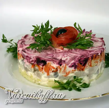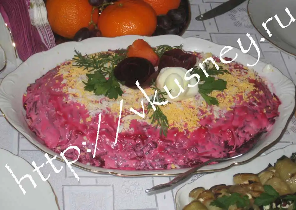 Главным ингредиентом салата стала конечно же сельдь, любимое лакомство пролетариев, которую Анастас дополнил крестьянскими луком, родной картошкой и морковью, ну и в завершении как кроваво-красное знамя укрыл это все слоем свеклы.