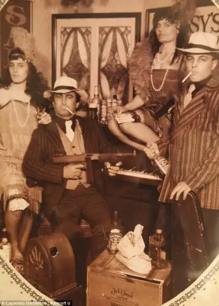 На этой фотографии, стилизованной под 20-ые, миссис Калп сидит на пианино в окружении своих детей, Алисии и Стивена, а ее супруг Том направляет на нее автомат.