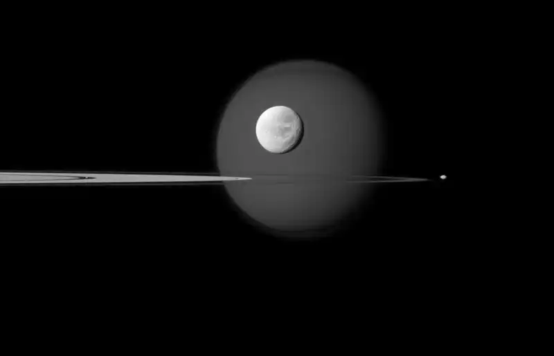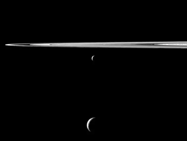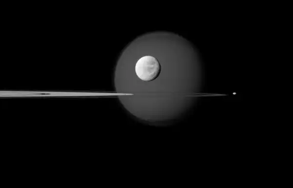 Сразу четыре луны Сатурна видны на этом снимке «Кассини». Самый большой спутник, Титан, диаметром 5150 км окутан плотной атмосферой. Диона несколько приподнята над плоскостью колец; по сравнению с мглистым Титаном Диона достаточно яркий объект. Другие два спутника, попавшие на это фото, вращаются в плоскости колец Сатурна. Это маленькая Пандора (справа от колец) диаметром 81 км и совсем крошечный Пан диаметром 28 км. Его можно найти в щели Энке слева на снимке. Пан и Пандора — спутники-пастухи. Они как бы «пасут» частицы колец Сатурна, не позволяя им уходить в стороны.