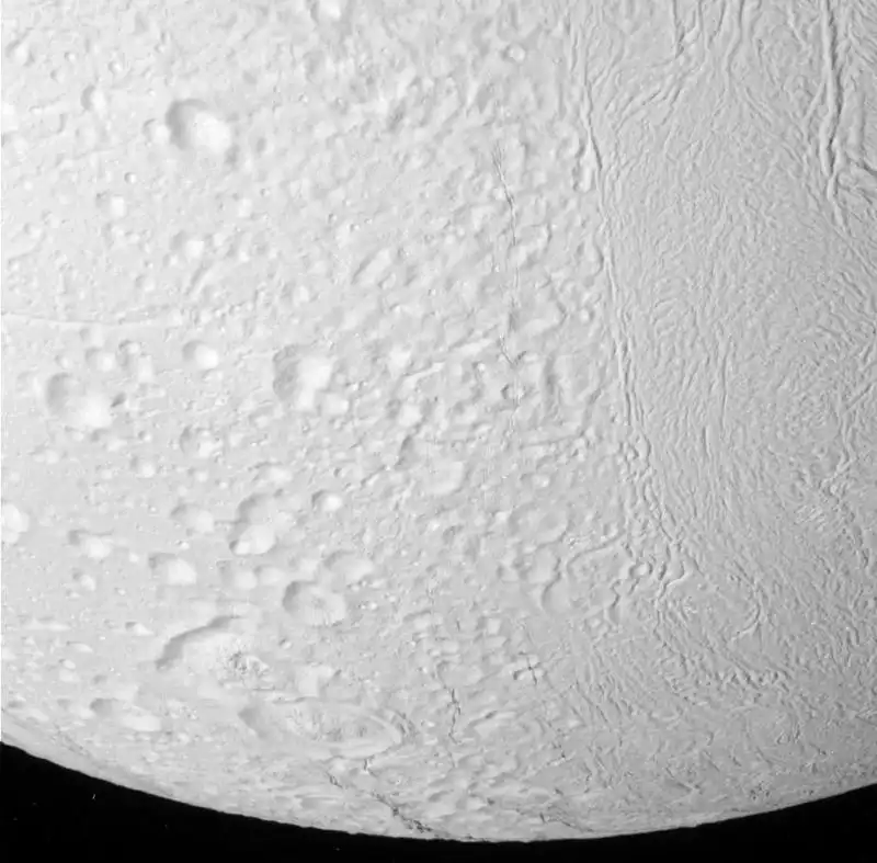 Энцелад. На этом снимке видны южные районы спутника (35 градусов южной широты, 45 градусов западной долготы). Энцелад — один из самых геологически активных спутников Солнечной Системы. Ученые предполагают существование океана жидкой воды под ледяной, испещренной трещинами и разломами корой спутника. На этом снимке, полученном 13 сентября 2011 года, Энцелад предстал с расстояния всего лишь 42000 км.