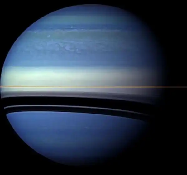 Тени от колец. После равноденствия, которое было на Сатурне в 2009 году, на газовом гиганте началась весна. Тени от колец с каждым месяцем становятся все шире и ползут дальше на юг. Этот снимок получен широкоугольной камерой космического аппарата «Кассини» 22 августа 2011 года, когда зонд находился немного выше плоскости колец. Съемка велась в ближнем инфракрасном свете (длина волны — 939 нм) с расстояния 405 тыс. километров.