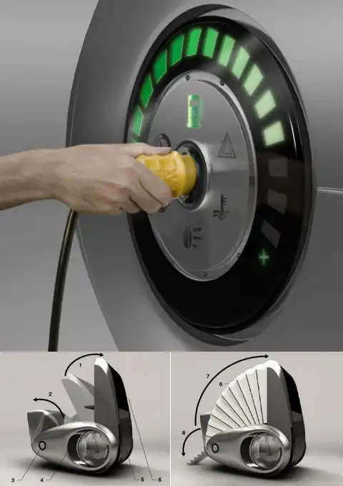 Как и у швейцарского ножа, у этого автомобиля визуально выделены две оси. Вокруг передней (там, где боковые окна) поворачивается раскладной чердак (1), вытягивающий за собой крышу-гармошку (7) с солнечными панелями (6). А вокруг задней точки поворота (3, она же внешняя панель управления и гнездо для зарядки) вращаются боковины кузова (они же двери с воздухозаборником, 4), задний входной тамбур с душем (2) и лестница (8). 5 – лобовое стекло (иллюстрации NAU).