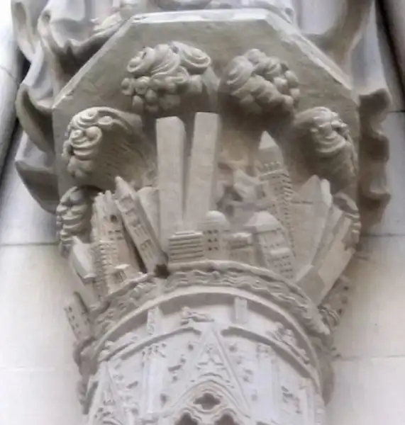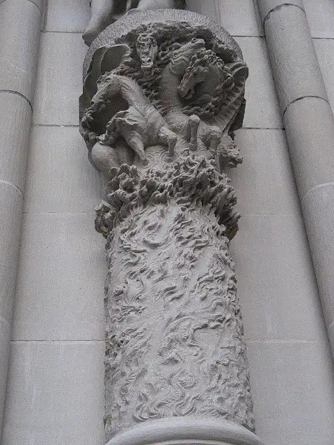 Нью-Йорк захлестнет большая океанская волна, от которой он падет. На капители колонны служащей постаментом для фигур на нём стоящих видны башни-близнецы. Колонны для храма были выполнены в 1997 году и скульпторы здесь несколько просчитались в прогнозе для этих конкретно небоскребов. Но по факту их уже нет, кто же мог знать что через 4 года их не станет. Другие узнаваемые объекты - Крайслер-билдинг и Ситигруп-центр.