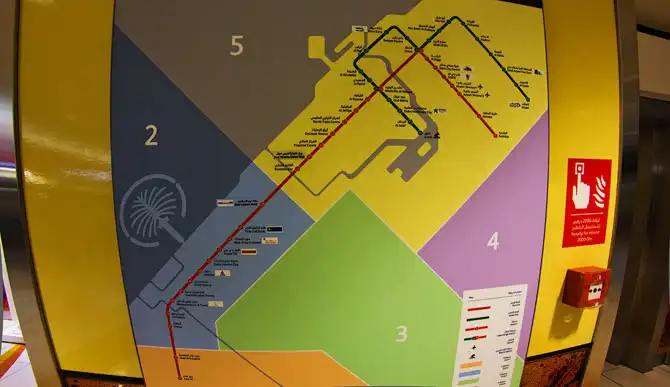 Схема метрополитена Дубая: на деле из двух веток функционирует только одна – Красная, Cокольническая :) Я поехал от станции «Dubai Marina» (что около пальмового острова – сложно не заметить) до станции «Al Rigga»