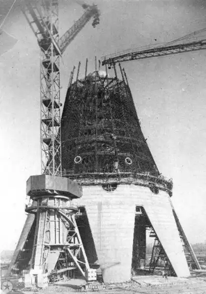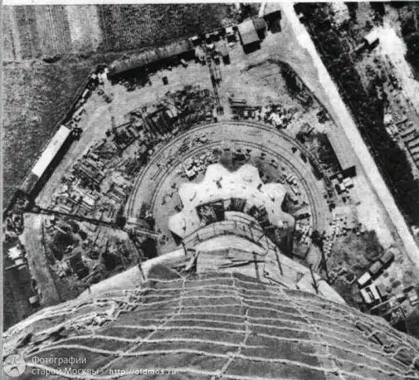 С высоты 385 м видны кольцевые пути наземных кранов. На переднем плане снимка видна брезентовая “юбка” с веревочным каркасом За ней размещаются подвесные подмости, с которых ведутся работы по закреплению наружной опалубки и осмотр наружной поверхности бетона.