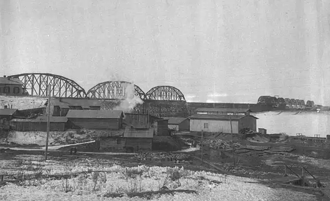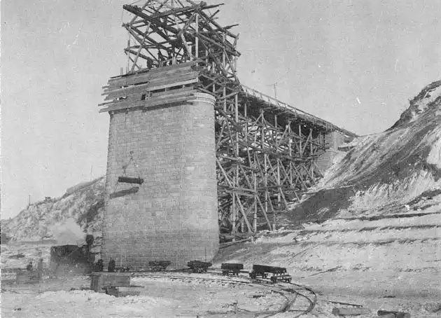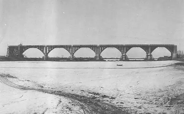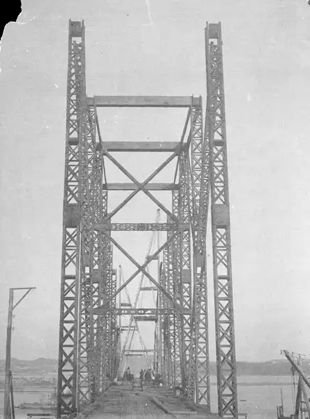 Сборка железных пролетных строений (всего - 18), доставленных в разобранном виде из Варшавы (завод акционерного общества "К. Рудзкий и К") южноморским путем (Одесса - Владивосток), производилась на месте строительства моста. Начало сборки: ажурные конструкции взмывают в высь.