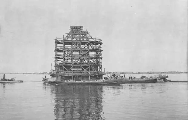 Сооружение русловой опоры-быка: на длинных лодках подвозится облицовочный камень.