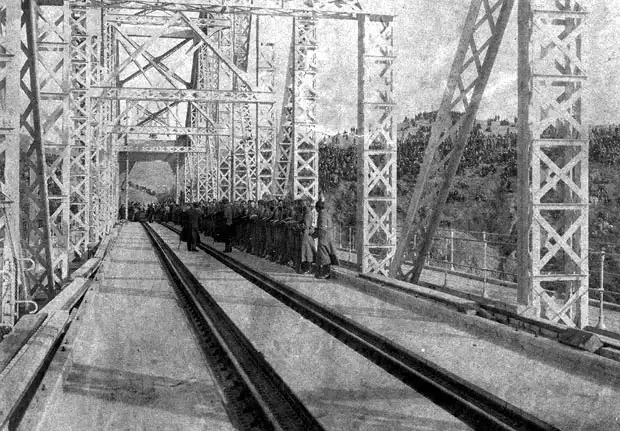 Первый поезд движется по мосту: заключительное звено Транссибирской магистрали замкнулось.