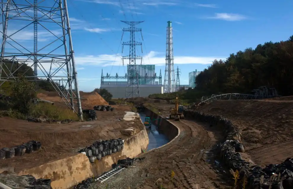 15. Работники компании «Tokyo Electric Power Co.» и японские журналисты проходят мимо новой морской баррикады рядом с АЭС Фукусима.