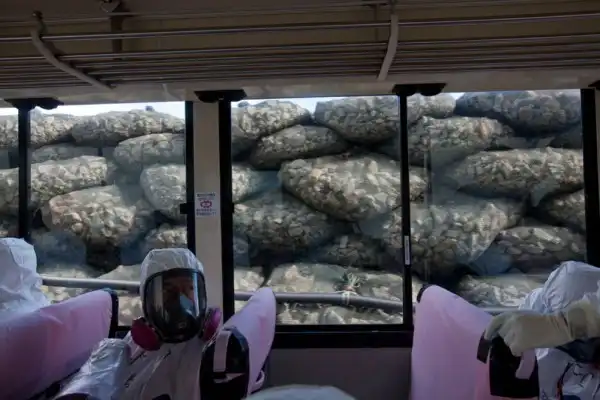 4. Жителям Хироно в защитных костюмах сообщают краткую информацию перед возвращением в свои дома, чтобы взять кое-какие вещи (в автобусы не поместятся крупные вещи).