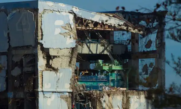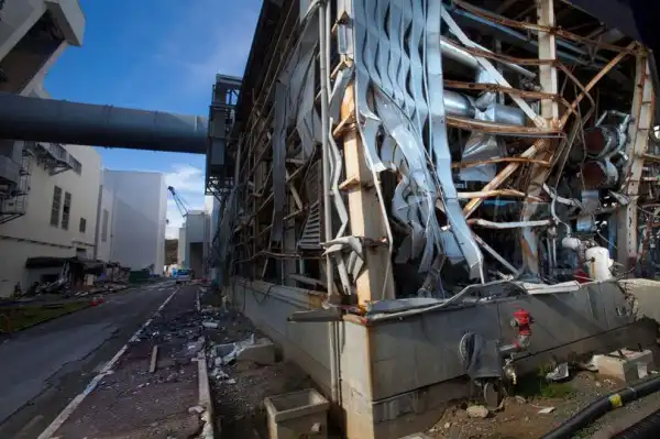 10. Пятый и шестой реакторы АЭС Фукусима – вид из окна автобуса в Футабе. Журналистов впервые пустили на завод после катастрофы, где они увидели ужасающую сцену запустения: перевернутые машины, потрескавшиеся здания реакторов и горы обломков и мусора.