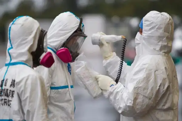 20. Женщину проверяют на уровень излучения после снятия защитного костюма.