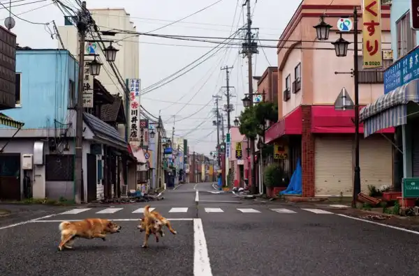 2. Две собаки дерутся на пустых улицах Окумы. В первые дни после катастрофы здесь было полно брошенных домашних животных – коров, свиней, коз, собак, кошек, даже страусов. Зачастую нарушая все запреты и баррикады, добровольцы пробирались сюда, отлавливали животных и воссоединяли с хозяевами, других кормили. Но к лету число животных резко сократилось – многие умерли от голода и болезней.