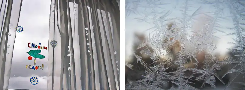 В любом детском магазине можно купить специальные витражные краски с трафаретами – подкладываешь под прозрачную пленку новогодний рисунок, обводишь, раскрашиваешь, ждешь, пока высохнет, и приклеиваешь на стекло, как переводную картинку! Ну а если в тебе есть творческий потенциал, бери краски, кисточки и воплощай на окнах и зеркалах собственное видение новогодних чудес!