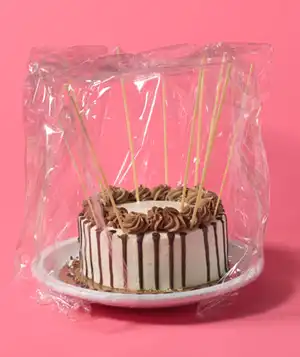 Все мы знаем, что для того, чтобы торт не засох нужно накрыть его целлофаном. Но что сделать, чтобы целлофан не примял крем? Оказывается, ответ прост – можно использовать сухие спагетти.