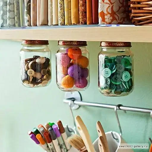 Веселая и оригинальная идея для хранения мелких предметов, для воплощения которой вам понадобится несколько стеклянных банок, полка и немного клея.