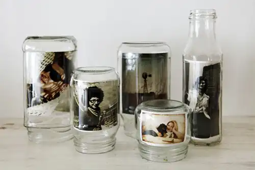 Из пустых стеклянных банок и бутылок могут получится оригинальные фоторамки.