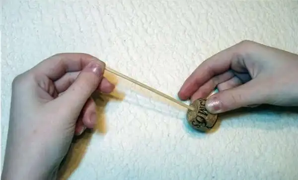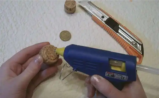 1. Делаем пенек. Разрезаем пробку от бутылки пополам, в нижней части приклеиваем монетку -для устойчивости.