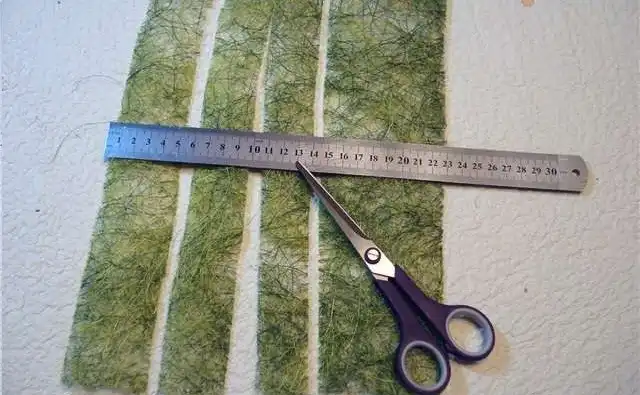 4.Формируем крону. Сизалевое полотно режем на полоски разной ширины, в зависимости от того, какой «пушистости» елочку мы хотим сделать. Каждую полосу режем на равносторонние треугольники и раскладываем их по размеру.