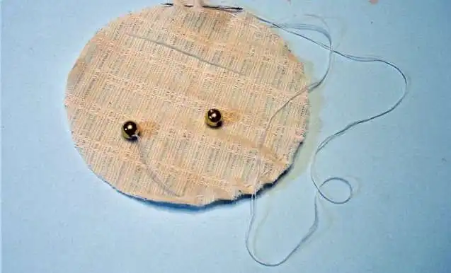 3. Декорируем пенек. На кусочке ткани циркулем чертим окружность, радиус которой равен: диаметр пенька + его высота + 1 см на сборку. Выкраиваем круг. Край ткани собираем швом «вперед иголка», отступив от края 0,5 см. Концы нитей оставляем на лицевой стороне ткани. Ставим ствол в середину круга и затягиваем нитку вокруг ствола, завязываем бантик. На концы нитей можно надеть бусинки.