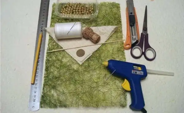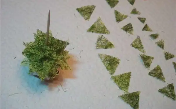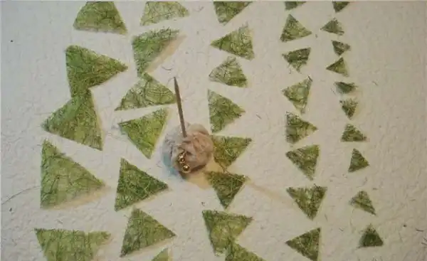 5. Собираем ёлочку. На ствол надеваем треугольники из сизали, протыкая их стволом посередине, начиная с самых больших и заканчивая самыми маленькими. Треугольники ориентируем произвольно, для создания большей «пушистости».