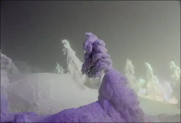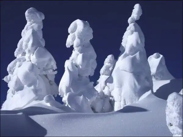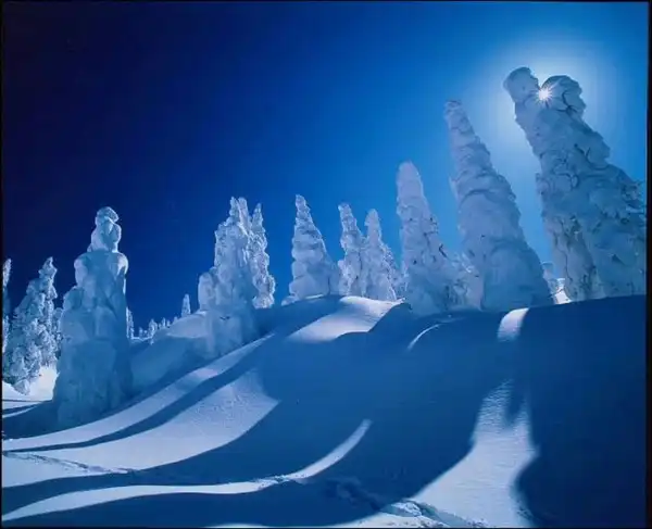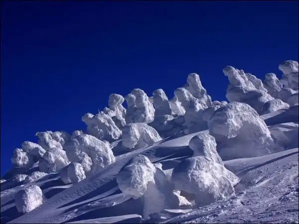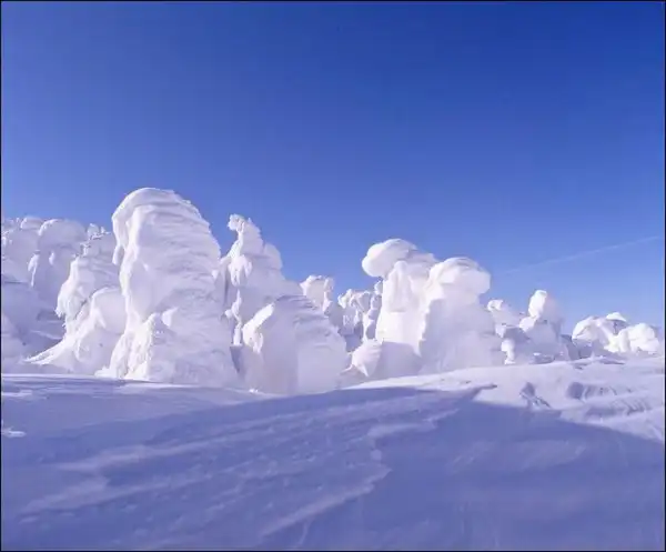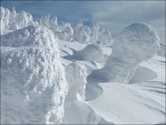 В зимних горных пейзажах северной части Японии есть удивительная особенность – деревья покрытые льдом и снегом.
